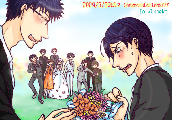 | 20××年6月 青春台にある小さな教会で結婚式が始まった。 マスコミやファンを一切シャットアウトして行われた式に集まったのは、それぞれの親族、友達、そして、青学テニス部だった仲間たち。 式の主役は、「サムライJr.」の呼び名でいまやテニスだけでなくあらゆるメディアを席巻している越前リョーマ、そして隣に並んでいるのは、初めてふたりが出会った中学一年生の頃からまったく変わる事の無い初々しさを漂わせている桜乃だった。 滞り無く式は進み、いよいよ次は参列者が密かに待ち望んでいたウエディングブーケ争奪戦(笑)が… 「…薫、ちょっと」 「なんすか、先輩」 「これ、持って」 「へ?なんすか、このヒモは…?」 「ふふ、ボクも参加しちゃおうかな…」 「不二はダメだ」 「乾…呪うよ?ま、でもいいや。海堂、絶対にそのリボン、離しちゃダメだからね、ふふ」 「ふ、不二先輩まで…ところで、何なんすか、この、ヒモは…」 「みなさーんっ、用意はいいですかぁ!それではいきますよっ!!」 沸き上がる会場が、静けさを取り戻したとき… 桜乃のブーケに繋がっていたただ一本のリボン、それは、薫の手の中にあった。 「え…?」 「海堂先輩、、、あ、あの、これ、受け取ってください…」 真っ赤になる薫の横には、嬉しさを隠しきれない乾の姿があり、元青学メンバーの失笑を誘っていた。 「あはははっ!!次の花嫁はマムシかよ〜、こりゃ、たまんねーなー、ひーっ」 「…桃先輩、笑い過ぎ…」 ![]() |